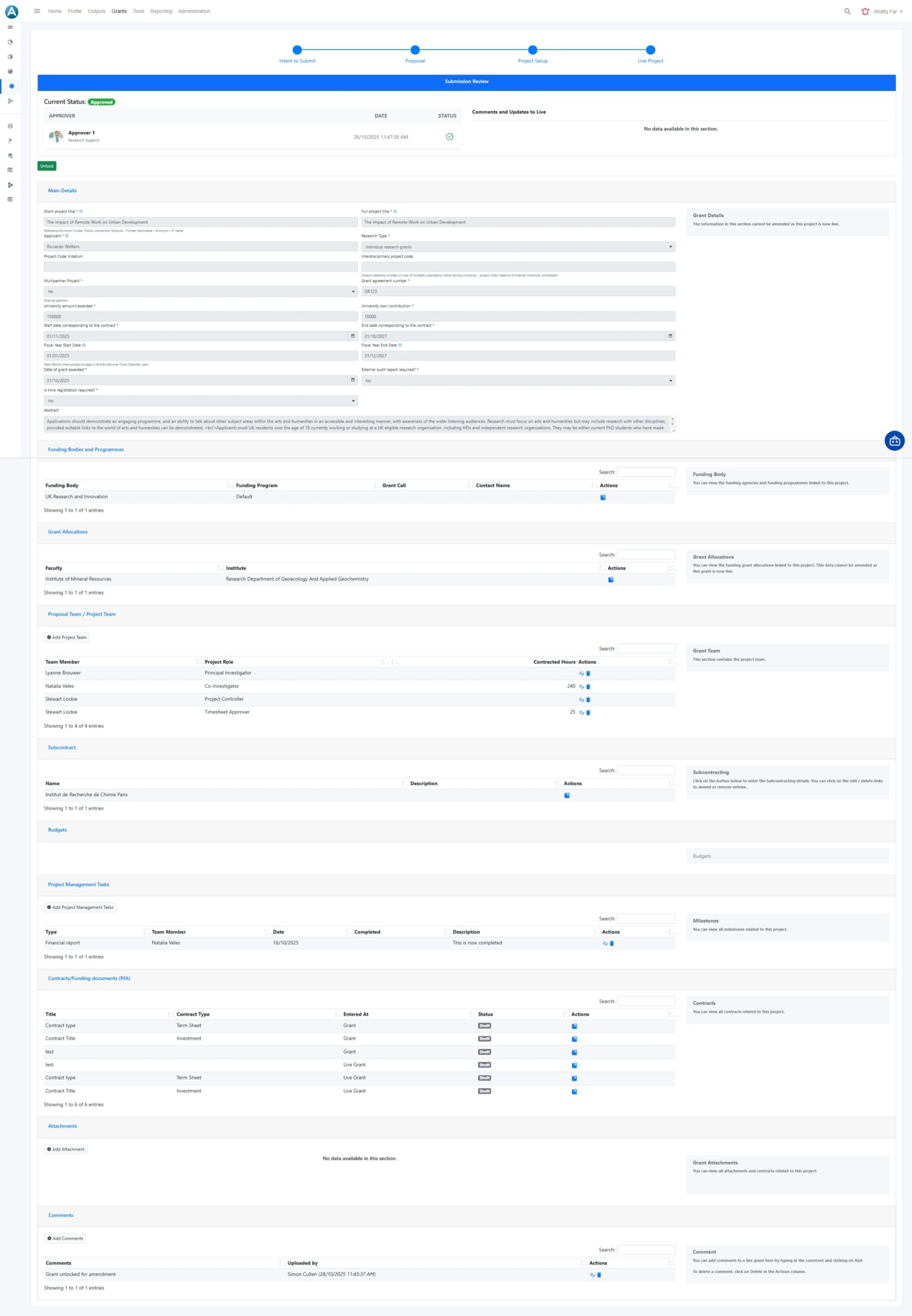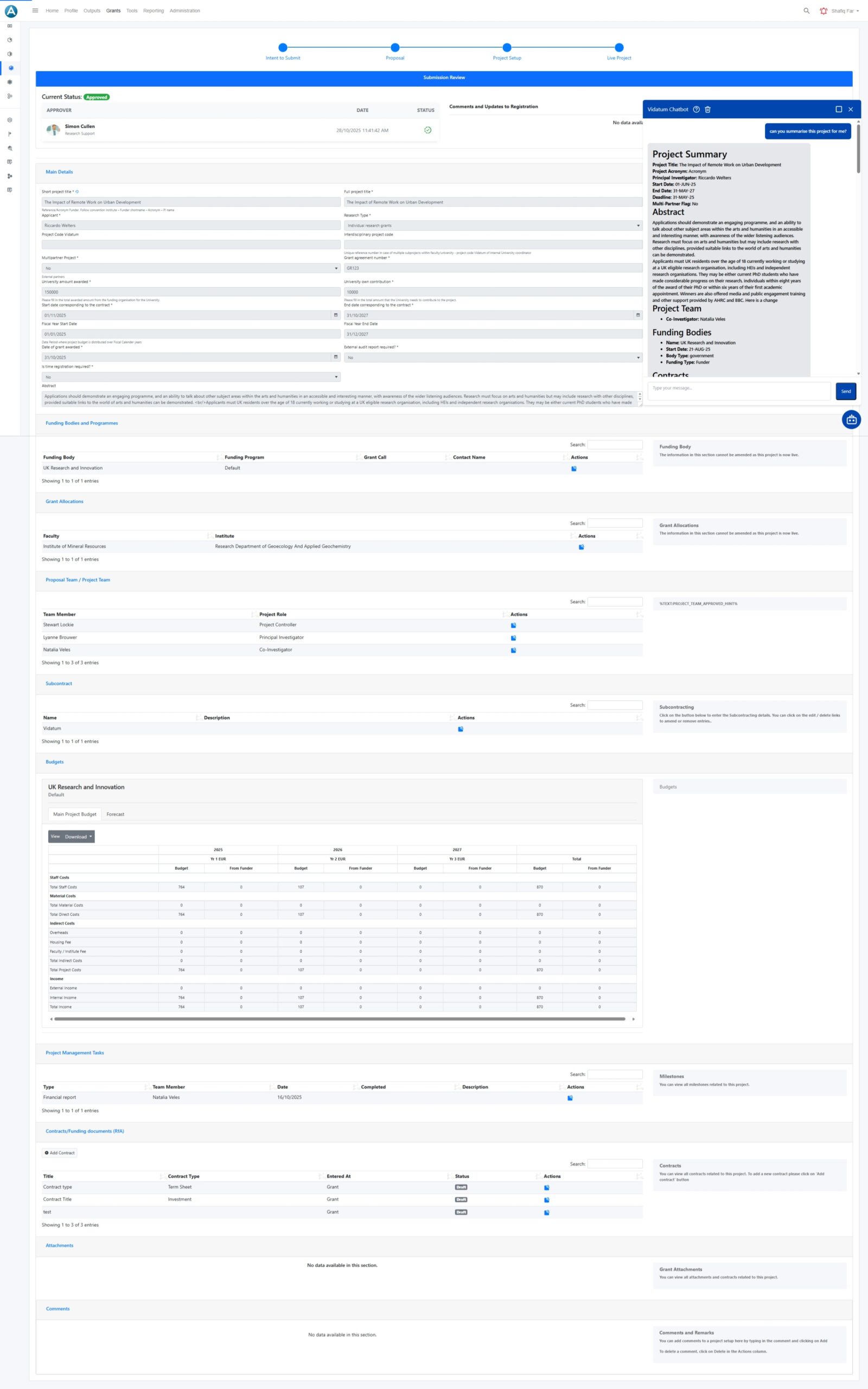 Vidatum Post Award provides a single live project record once funding is approved. It brings together grant details, budgets, teams, contracts, and reporting requirements to maintain financial and operational control throughout the project lifecycle.