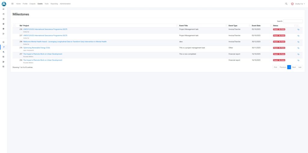 Milestones and project tasks allow institutions to track deliverables, reports, and funder requirements over time. Clear status indicators support timely reporting and reduce missed obligations.