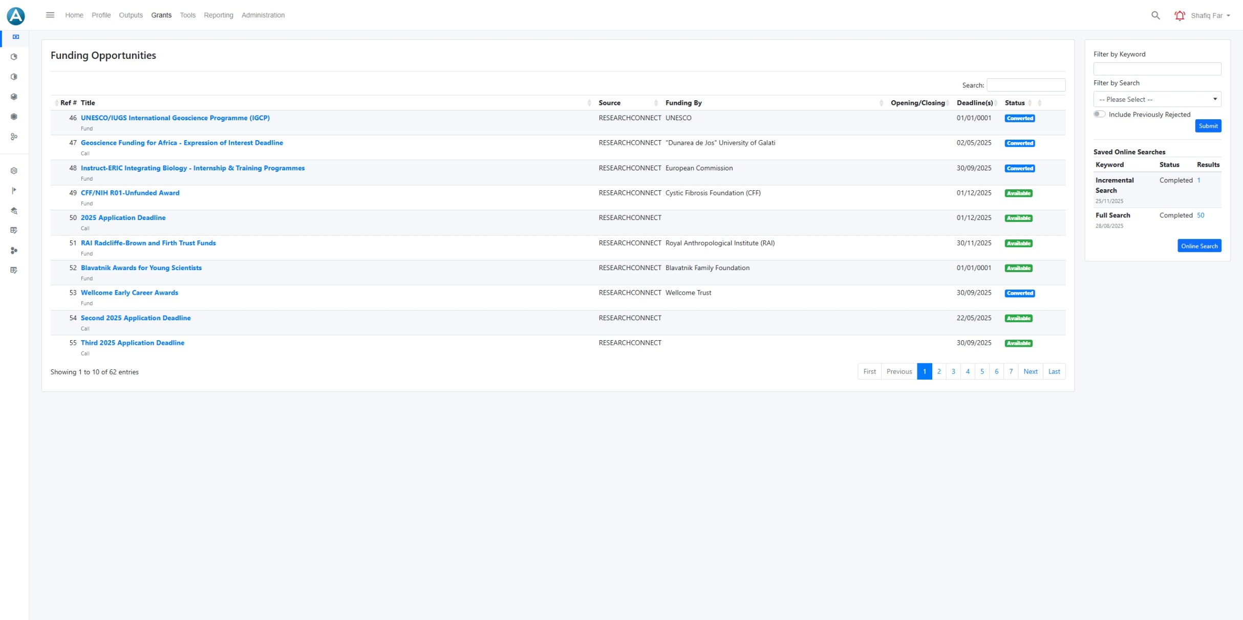 Funding opportunities provide a structured view of available calls and programmes. Institutions can manage discovery, tracking, and conversion of opportunities into active submissions.
